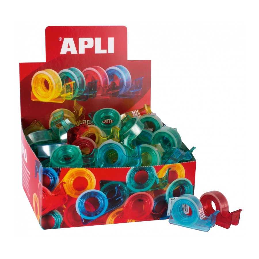 Portarrollos de cinta adhesiva de color con rollo de cinta transparente 15 mm x 10 m. Cinta transparente de 28 micras de desenrollado silencioso. Portarrollos con terminación dentada en plástico compatible con rollos de 19 mm x 33 m. Ideal para uso escolar.