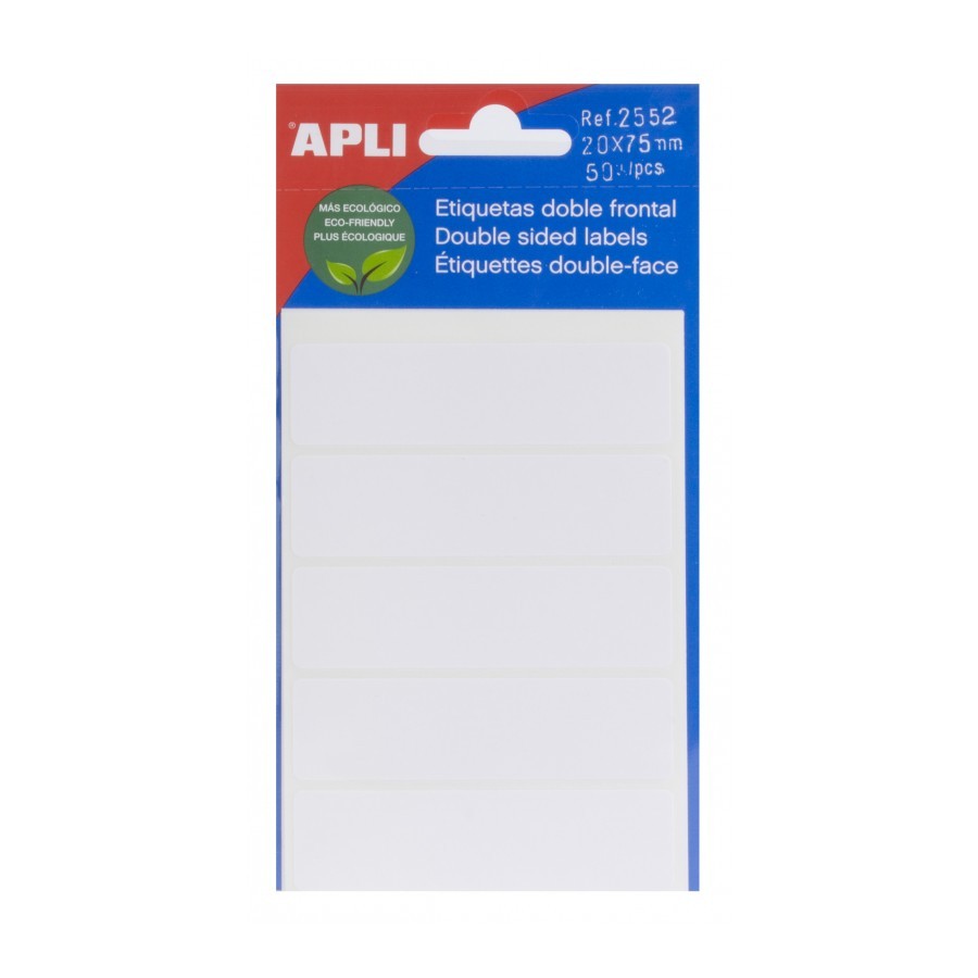 Etiquetas doble frontal en color blanco, cantos romos y tamaño 20,0 x 75,0 mm con adhesivo permanente. Cada bolsa contiene 5 hojas (doble frontal) con 50 etiquetas. Las etiquetas doble frontal permiten tener más etiquetas en el mismo espacio. Etiquetas fabricadas con un solo papel soporte y con etiquetas de adhesivo permanente en ambos lados del papel (frontal y dorso). Más ecológicas: al tener solo un papel soporte generan menos residuos. ¡Un fantástico 2×1! Etiquetas aptas para escribir sobre ellas con lápiz, bolígrafo (incluso de tinta gel) o rotulador, permitiendo un secado rápido de la tinta.