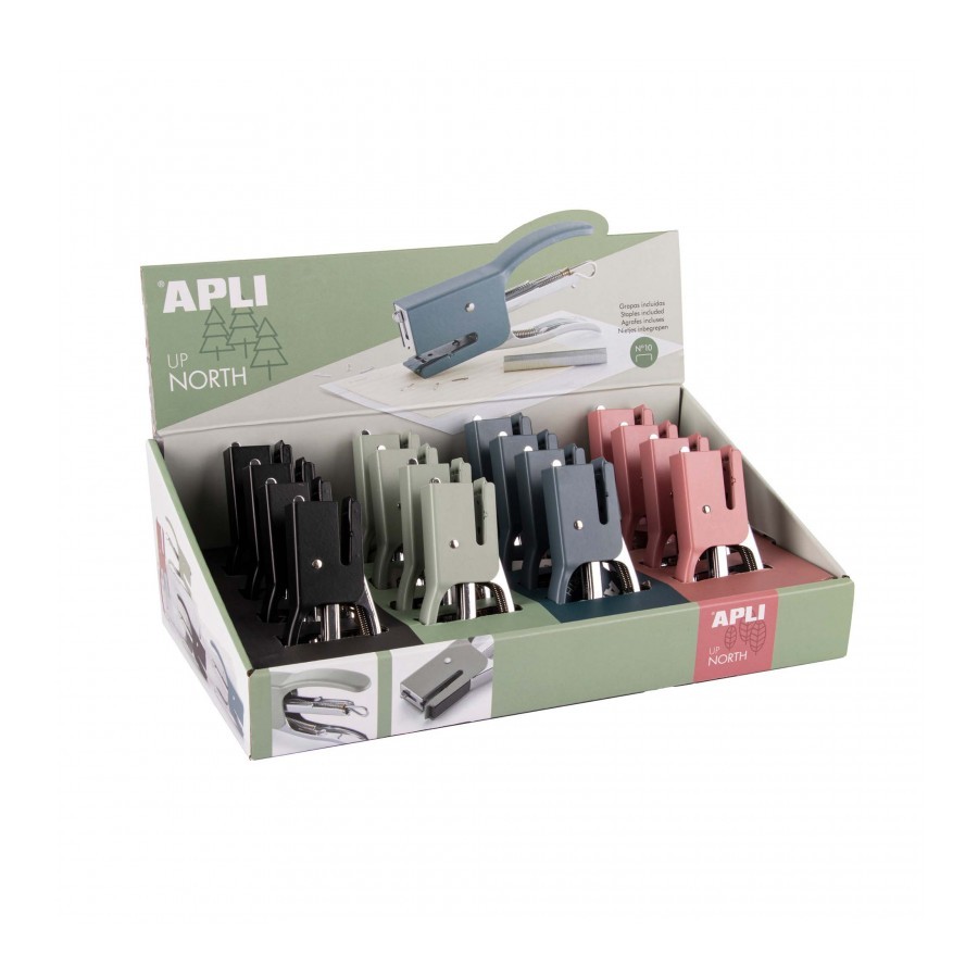Las grapadoras de metal son útiles para cualquier tarea, incluyen una recarga de 50 grapas no. 10. El expositor contiene 16 grapadoras de tamaño 110 x 55 x 18 mm de diferentes colores: rosa, verde, beige y azul grisáceo.