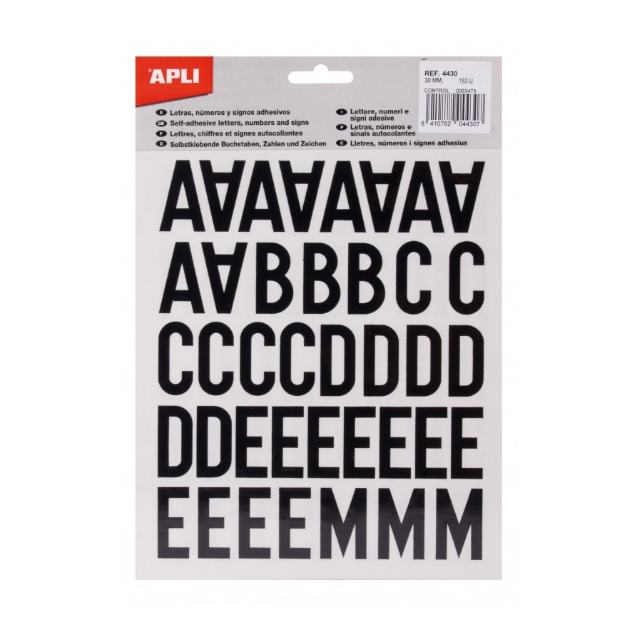 Letras de palo mayúsculas adhesivas de altura 30 mm en color negro. El pack contiene 4 hojas (153 letras). Con estas letras adhesivas podrás identificar y señalizar todo lo que necesites de manera rápida, limpia y eficaz. Encuentra el tamaño que más se adapte a tus necesidades dentro de la gama APLI.
