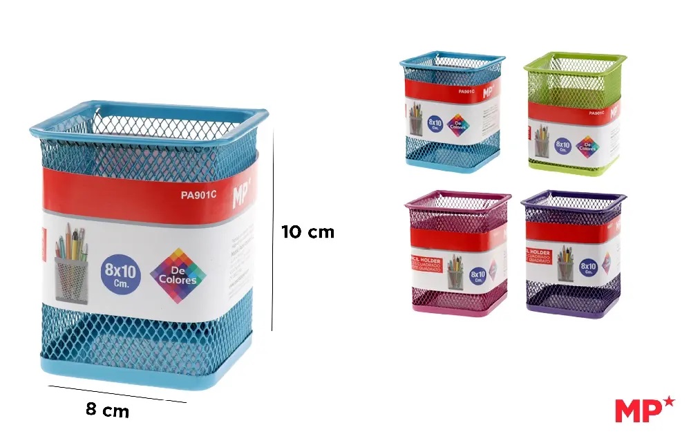 Portalápices de sobremesa fabricado en metal de rejilla. Perfecto para poner lápices, bolígrafos, rotuladores, correctores… y tenerlos a mano y ordenados. Cuadrado. 80 mm de ancho. 100 mm de alto. Tres colores surtidos disponibles: azul, verde y rosa.