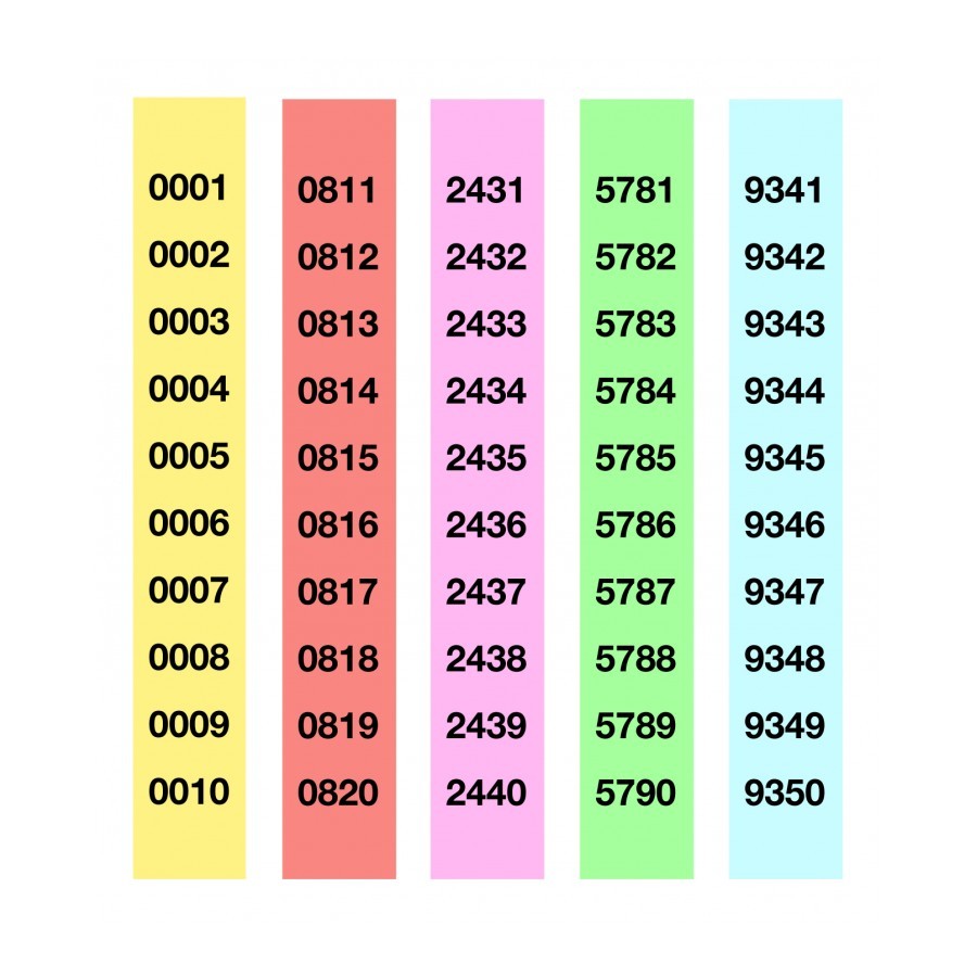 Tira de lluminetas sin microperforado en papel litos, tamaño 30 x 210. Surtido de 5 colores: amarillo, naranja, rosa, verde y azul (2 tiras de rifa por color). Numeración del 0000 al 4.999. Cada hoja contiene 10 números con matriz para una fácil separación.
